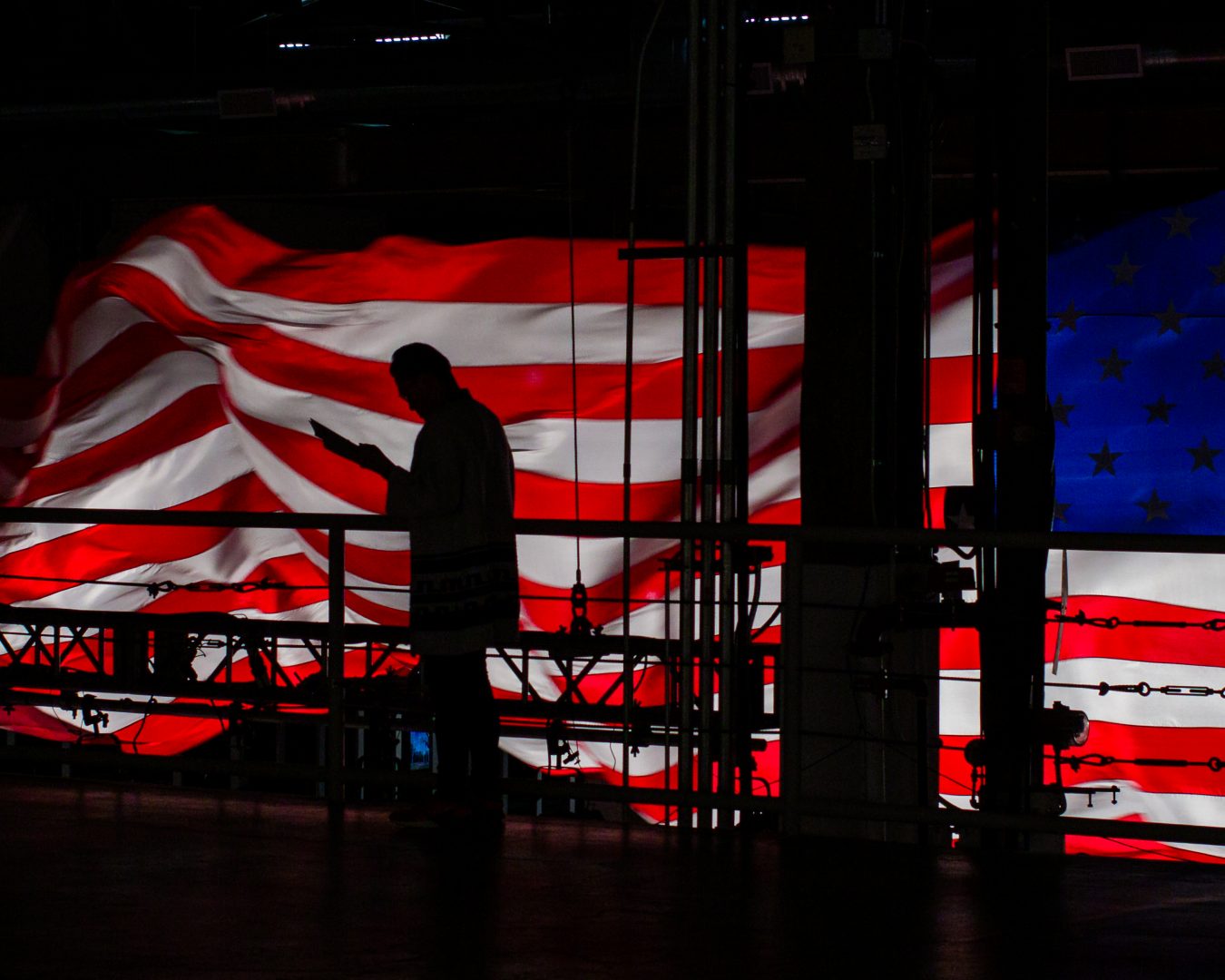 A man standing in front of the William Pope.L: Trinket exhibition at the Geffen Contemporary at MOCA Museum in Los Angeles, CA.
